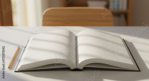 Open textbook and pencil with copy space on table, homeschooling and remote learning concept
