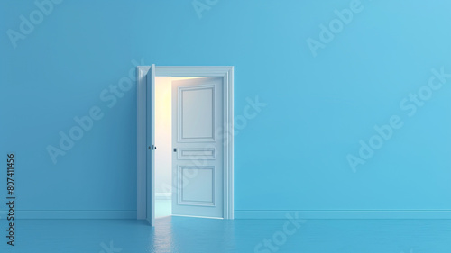 Open the door. Business concept. 3d render, white light inside open door isolated on blue background. Modern minimal concept.