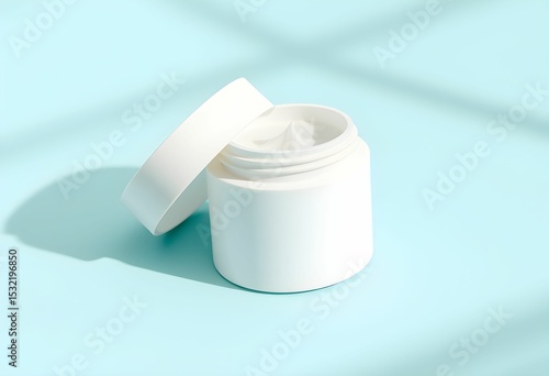 Open white jar of cream on a light blue surface with a window shadow.