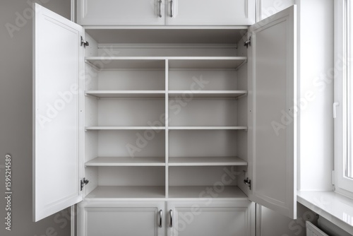 Open white wardrobe with empty shelves