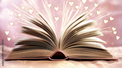 Opened book glows with light and floating hearts, symbolizing love and magic