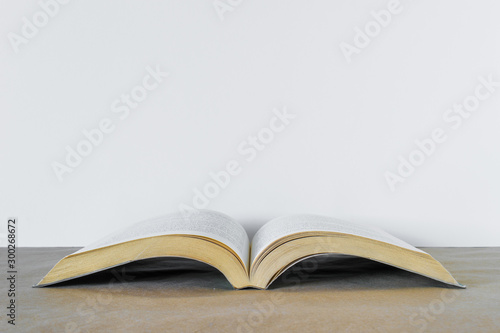Opened book over brown table at white background