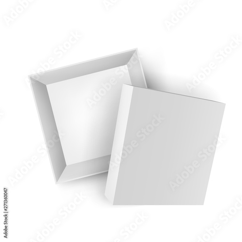 Opened delivery cardboard box with cap mockup. Top view of blank paper empty box isolated on white background. Realistic 3d pasteboard cube container with shadow vector illustration. Gift packaging