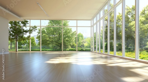 Open-space office interior with large windows and wooden flooring. Bright workspace.