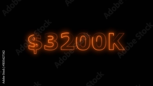 Orange color neon bright $3,200K number for finance and success themed 4k illustration. Perfect for financial 4k illustration. Digital or currency Maney themes. Black background 4k illustration.
