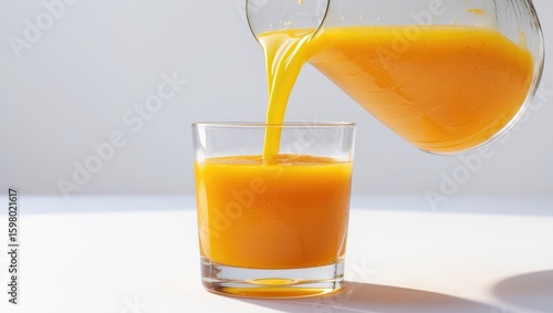 Orange juice being poured into a glass, showcasing a fresh beverage concept. Healthy drink and refreshment. The concept of breakfast and beverages.
