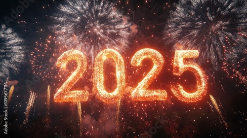 Orange letters spelling "2025" stand out on a dusky sky, accompanied by a vibrant display of white and red fireworks.