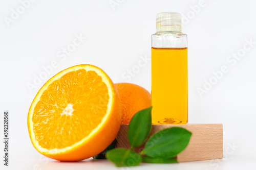 Orange oil for the body. Orange on a wooden pedestal on a white background. Organic SPA cosmetics with herbal ingredients.