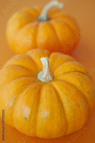 Orange pumpkins on a vibrant orange background ready for harvest