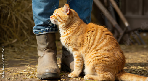 Orange tabby cat rubbing against person leg in blue jeans with brown boots on barn floor with hay. Farm feline companionship for rural lifestyle content and animal care visualization
