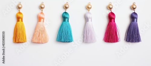 Orange tassel earrings on a white backdrop with copy space image.