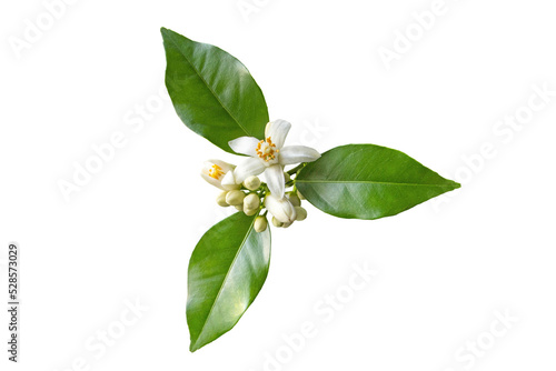 Orange tree white fragrant flowers, buds and leaves isolated transparent png. Neroli blossom.