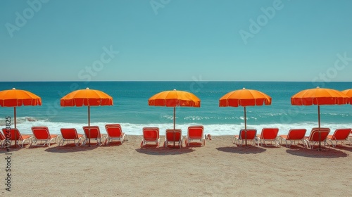Orange umbrellas and red beach chairs on sandy beach by calm ocean.