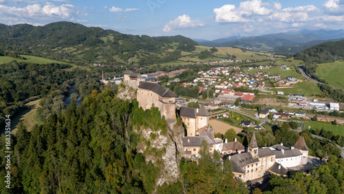 Orava Castle perched on dramatic cliffs above the Orava River in Slovakia. Sunset light reveals medieval architecture and breathtaking landscape. Ideal for history and travel visuals