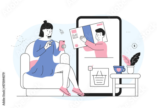 Order delivery online. Girl buying goods in online store. Man with bonus card on smartphone screen. Special marketing offer for regular clients. Linear vector illustration