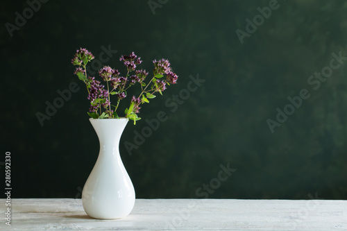 oregano in white vase on green background