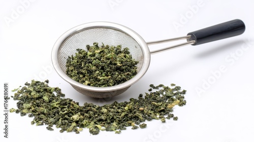 Organic green tea leaves ready for infusion in fine mesh strainer for healthy drink preparation.