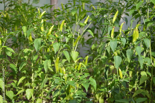 Organic growing green hot chilli pepers