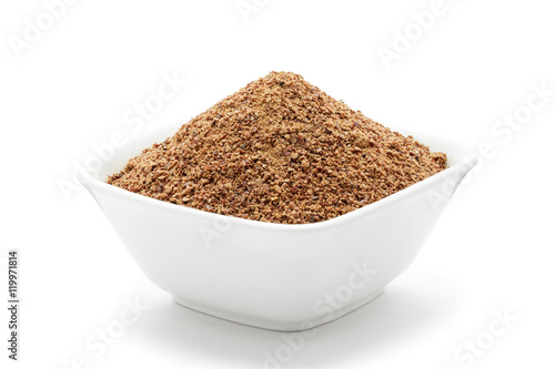 Organic powder of Indian Jujube (Ziziphus mauritiana) in a white ceramic bowl. Isolated on white background. Front view.