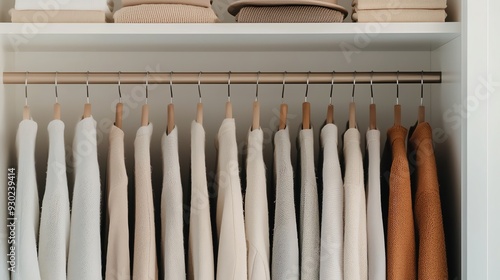 Organized closet featuring neatly hung shirts and folded blankets in neutral tones, perfect for modern home decor.