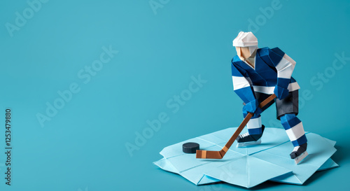 Origami hockey player in action on a blue background created with precision and detail