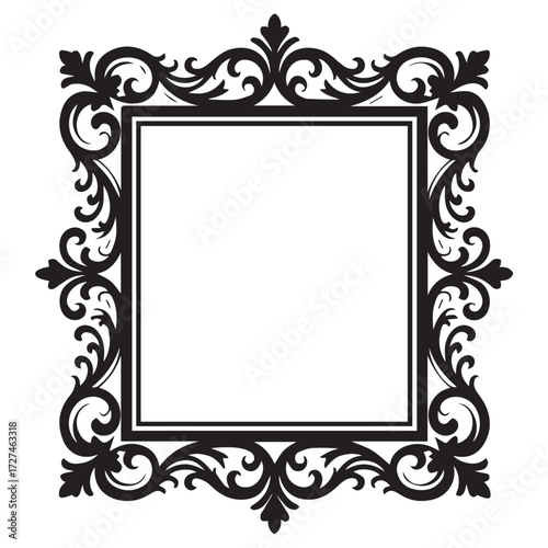 Ornate black square frame with decorative scrollwork and floral elements, isolated on white background technology background