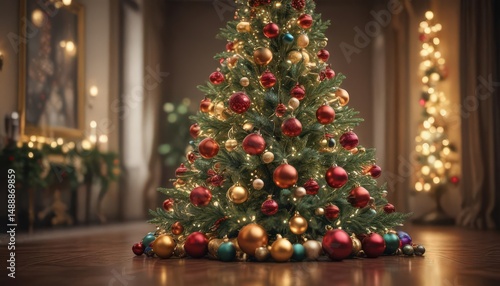 Ornate Christmas tree, vibrant baubles, soft bokeh lights, holiday, bokeh, bright