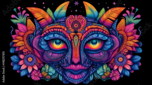 Ornate, colorful feline visage with floral and ornamental detailing on a dark background