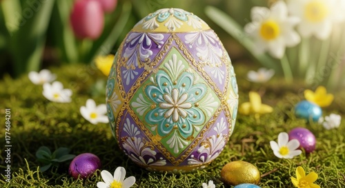 Ornate decorated easter egg surrounded by flowers in a spring setting