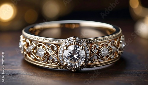 Ornate diamond ring on wooden surface