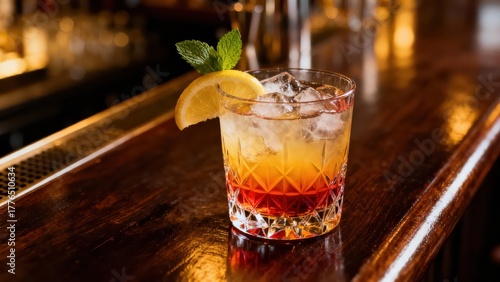 Ornate glass holds layered chilled beverage garnished with citrus slice and fresh herb sprig on polished wood surface