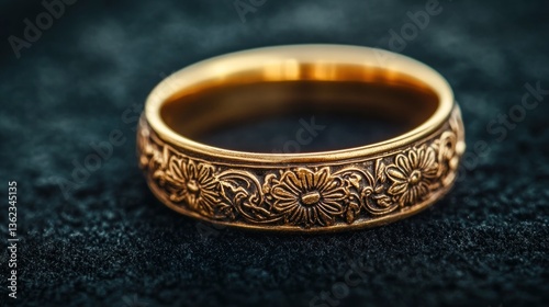 Ornate gold ring on dark suede