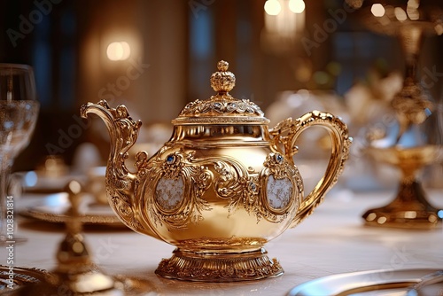 Ornate Gold Teapot with Intricate Design and Blue Gemstones