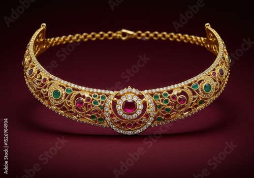 Ornate golden jewelery with gems on a red background in a studio environment