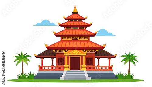 Ornate, multi-tiered, red-roofed structure on a stone base with palm trees and clouds against a white background