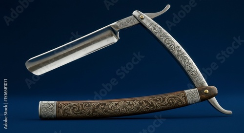 Ornate straight razor with etched handle and blade, displayed against a deep blue backdrop