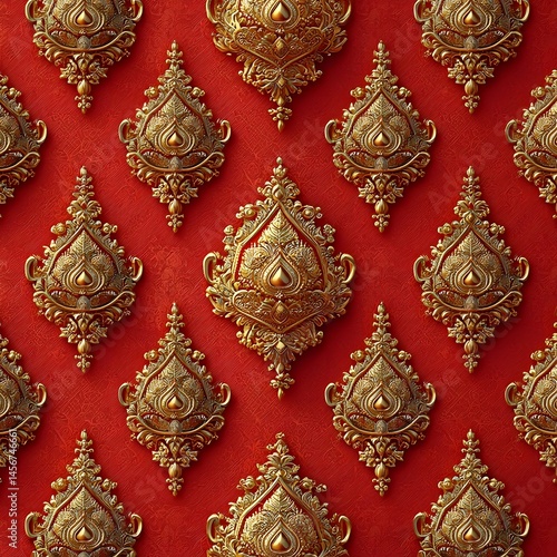 Ornate Thai Textile Pattern with Golden Diamond Motifs