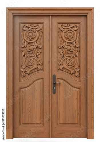 Ornate wooden double door with intricate carvings isolated on white background