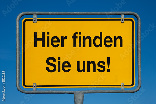 Ortsschild mit blauem Himmel HIER FINDEN SIE UNS!