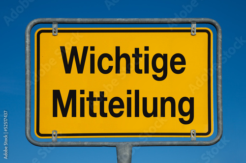 Ortsschild mit blauem Himmel WICHTIGE MITTEILUNG