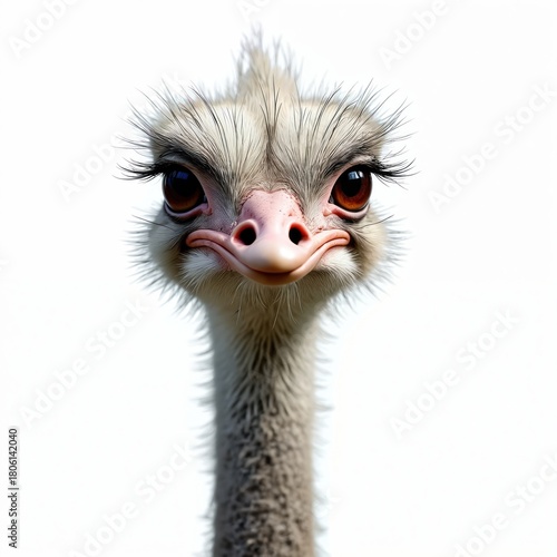 Ostrich face closeup. Large brown eyes, pink beak, and fluffy neck feathers. This flightless bird looks directly at camera with a curious expression. Great for educational or humorous content.