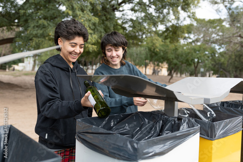 oung women between 22 and 24 years old committed to the environment. Placing plastic bottles in appropriate containers. Avoiding plastic pollution.