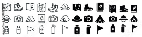 Outdoor adventure solid icons set – camping, hiking, nature symbols