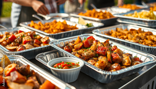 Outdoor catering of fajitas and other Mexican food in aluminum trays, hyperrealism. White tone