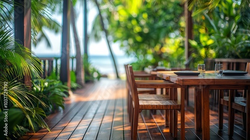 Outdoor dining area with a beautiful ocean view and palm trees