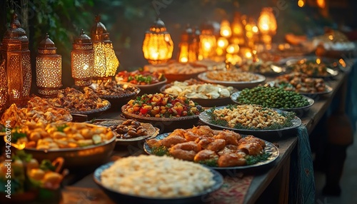 Outdoor feast table filled with a variety of colorful dishes including salads, cooked vegetables, bread, and appetizers lit by warm decorative lanterns creating a cozy evening atmosphere