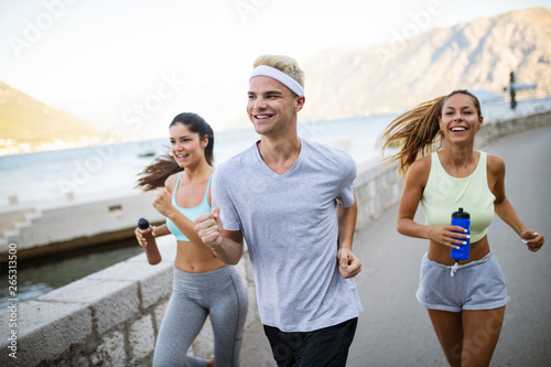 Outdoor portrait of group of friends running and jogging in nature
