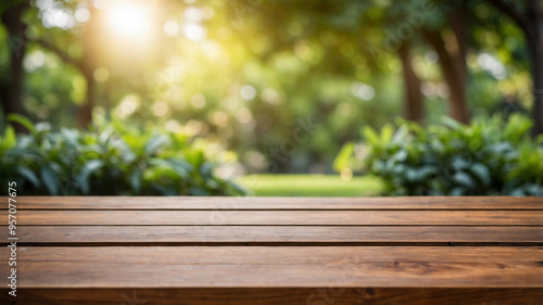 Outdoor wooden table with lush green foliage in the blurred background on a sunny day, creating a cozy feel.