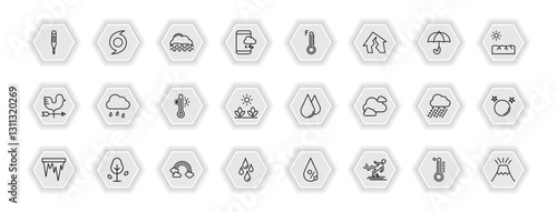 outline icons set - weather concept. vector icons included thermometer, foggy, farenheit, drizzle and more.