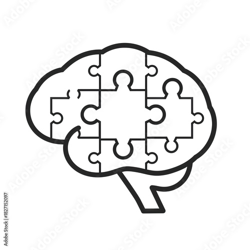 Outline of a brain formed by jigsaw puzzle pieces on a black background representing cognitive function and problem solving